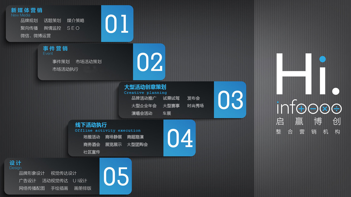 服务项目,北京启赢博创整合营销机构,启赢博创(INFOOOO)是国内最新锐的以品牌营销为基础,以新媒体营销、事件营销、娱乐营销、大数据营销管理以及新锐设计为特色的专业公关营销服务机构